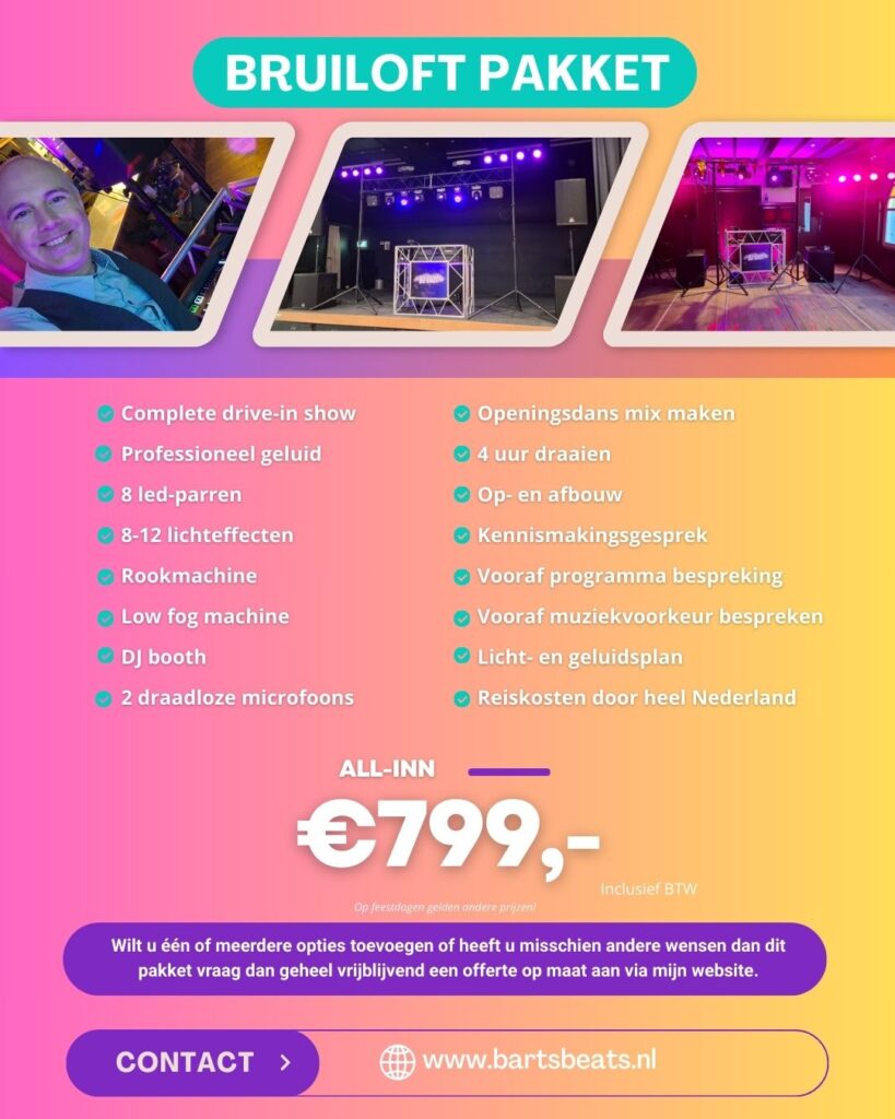 Om het u zo makkelijk te maken heb ik alvast een bruiloft pakket voor u samengesteld. Wilt u iets toevoegen, of heeft u misschien andere wensen? Vraag dan geheel vrijblijvend een offerte aan op de offerte pagina.