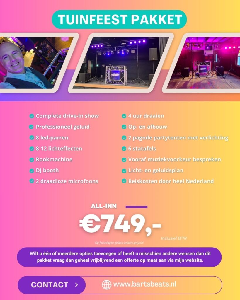 Om het u zo makkelijk te maken heb ik alvast een tuinfeest pakket voor u samengesteld. Wilt u iets toevoegen, of heeft u misschien andere wensen? Vraag dan geheel vrijblijvend een offerte aan op de offerte pagina.